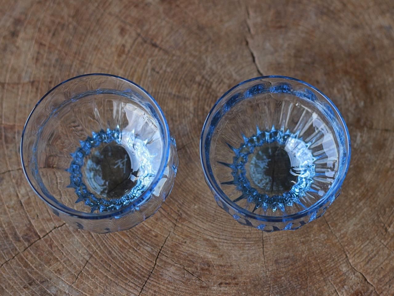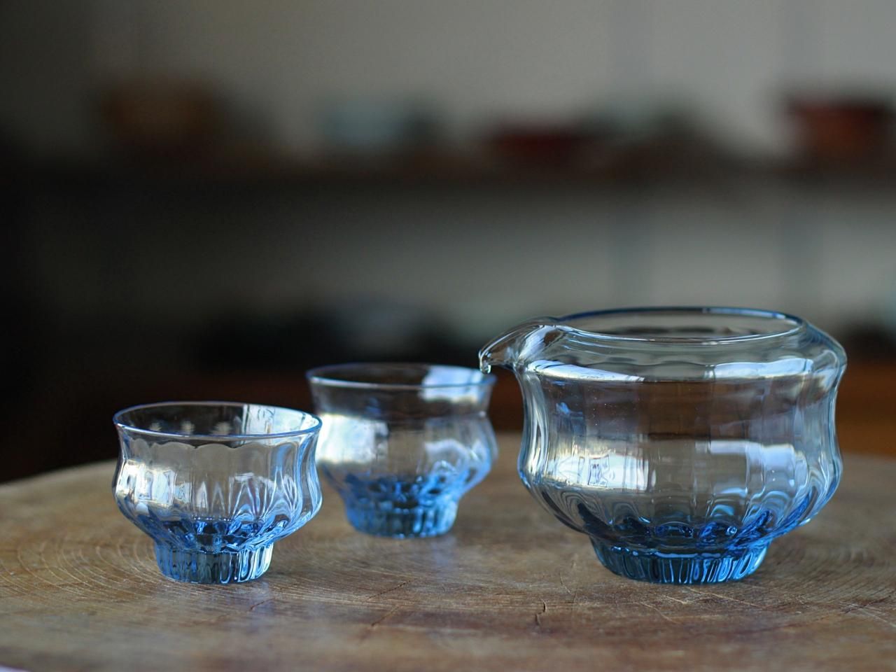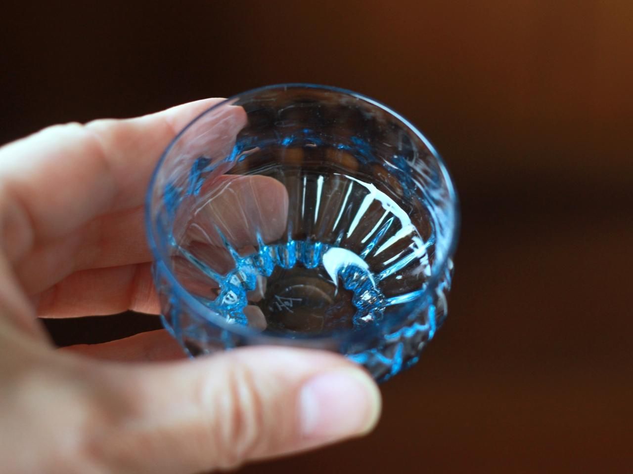 透き通った青は、お米や藁の灰をガラス原料と共に高温の窯で熔かすことで発色させています。